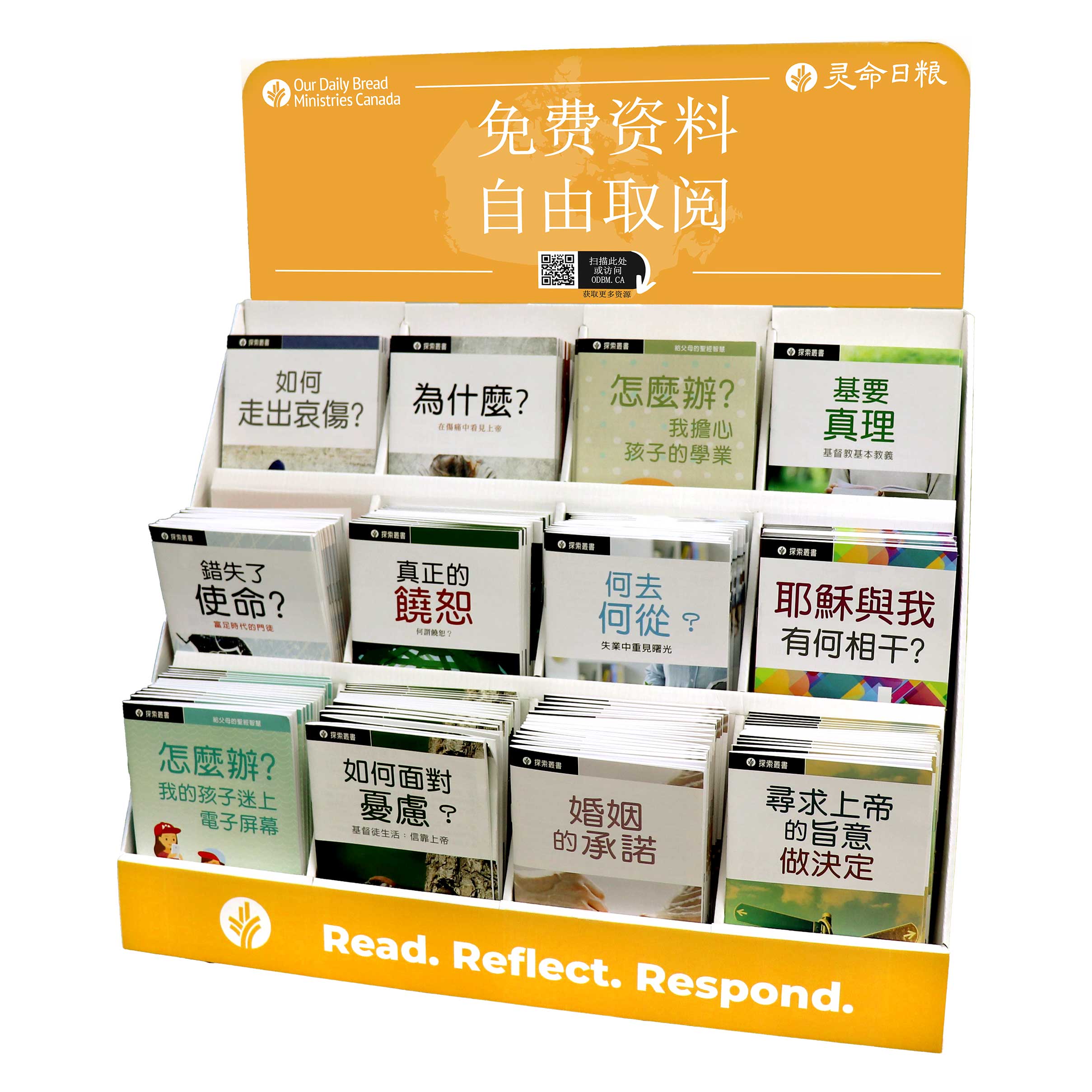 • Giving Up On Perfect (Q0618) • When Anger Burns (CB942) • Overcoming Worry (Q0711) • Comparison: The Thief of Joy (Q0748) • Finding Peace in a Troubled World (Q1126) • Clinging to Hope in the Storm (Q0746) • Life After Loss (CB131) • Why? Seeing God in Our Pain (CB151) • New Life: Transforming Power of the Gospel (Q0417) • It’s Not Fair: Trusting God (Q0719) • What To Do With a Broken Relationship (Q0703) • When God Says No (Q0736) This special resource display is available at no charge and is a great resource for your church. Order now for immediate delivery. Our Daily Bread Ministries Canada reserves the right to limit or decline display orders based on felt needs and availability.